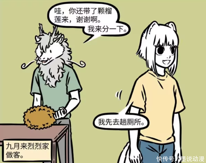 《非东谈主哉》漫画版中,九月去串门最多的地点,就是敖烈家。这一次九月是带着一颗榴莲过来敖烈家开云体育,还碰到敖烈的一又友张章。张章的苦衷王人会写在脸上,基本是藏不住事。敖烈邀请张章一谈吃榴莲,没思到他差点被送走。
