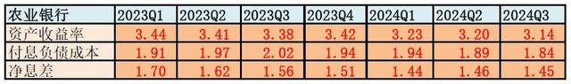 从表2中可以看到农业银行24年第三季度单季的净息差为1.45%,环比着落1bp。本年前三个季度农行的单季净息差区别是1.44%,1.46%,1.45%,初步筑底特征赫然。然则,辩论到将来存量按揭利率下磨灭LPR新一轮下调的影响,揣度背面净息差还有下降的情况。然则,揣度降幅和这两年比较会权臣收窄。