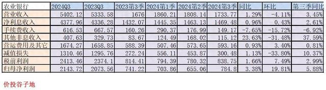凭据2024年三季报,农业银行贸易收入5402.12亿,同比客岁同时增长1.29%。农行净利息收入4377.96亿,同比客岁同时增长0.96%。非利息收入中,手续费和佣金收入616.53亿,比客岁同时下降7.65%。包摄鼓动净利润2143.72亿,同比客岁同时增长3.38%。更多细节的数据和环比数据参考表1: