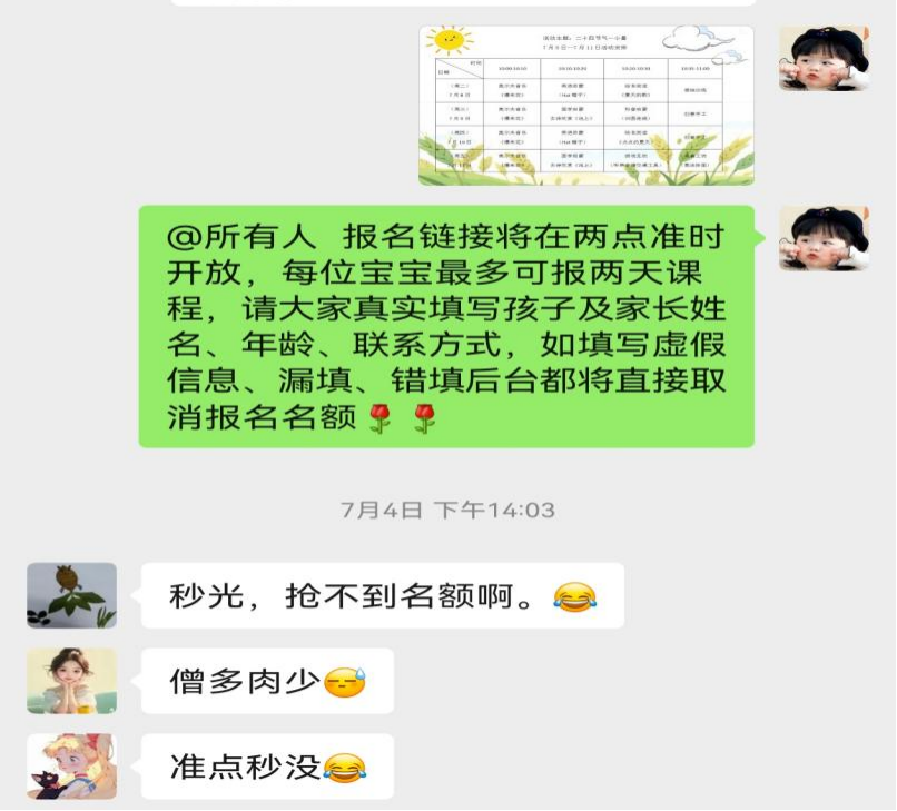 如今,上横朗社区当今一共有三个家长群,揣测800多东说念主,每周会发布后一周的早教课程,每周四节课,每节课截至在25东说念主傍边,不到1分钟就被抢光。