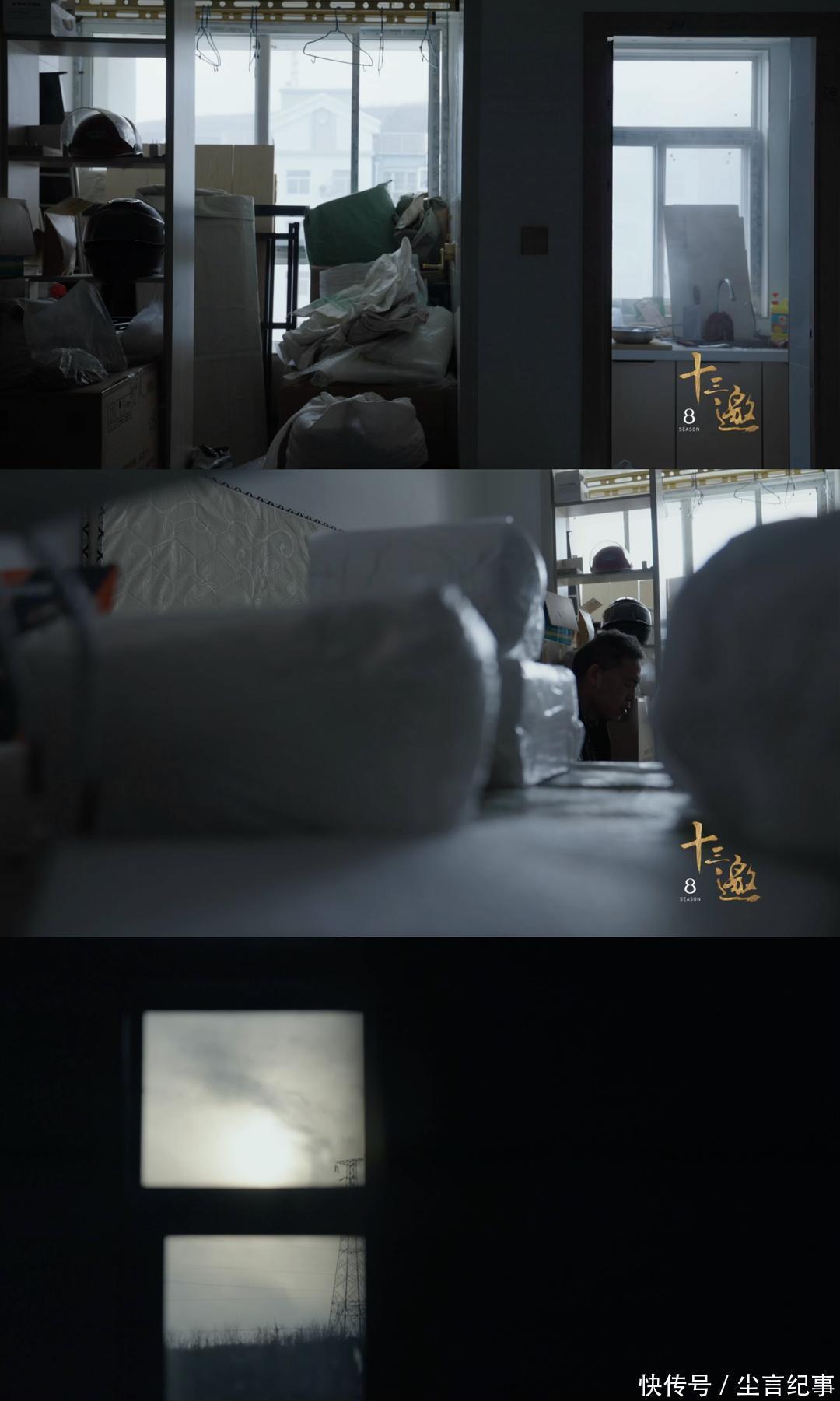 回到家中,快要9秒的空镜,画面切割两半,一半杂货间,一半冒着隐微蒸汽的厨台,此后镜头透过货架,窥视陈年喜,举座呈现出一种逼仄、压抑的嗅觉,以此来突显东谈主在其中的处境。哪怕他望向窗外,也仅仅在黑乌乌的墙壁中,凿出两扇阴晦的光。