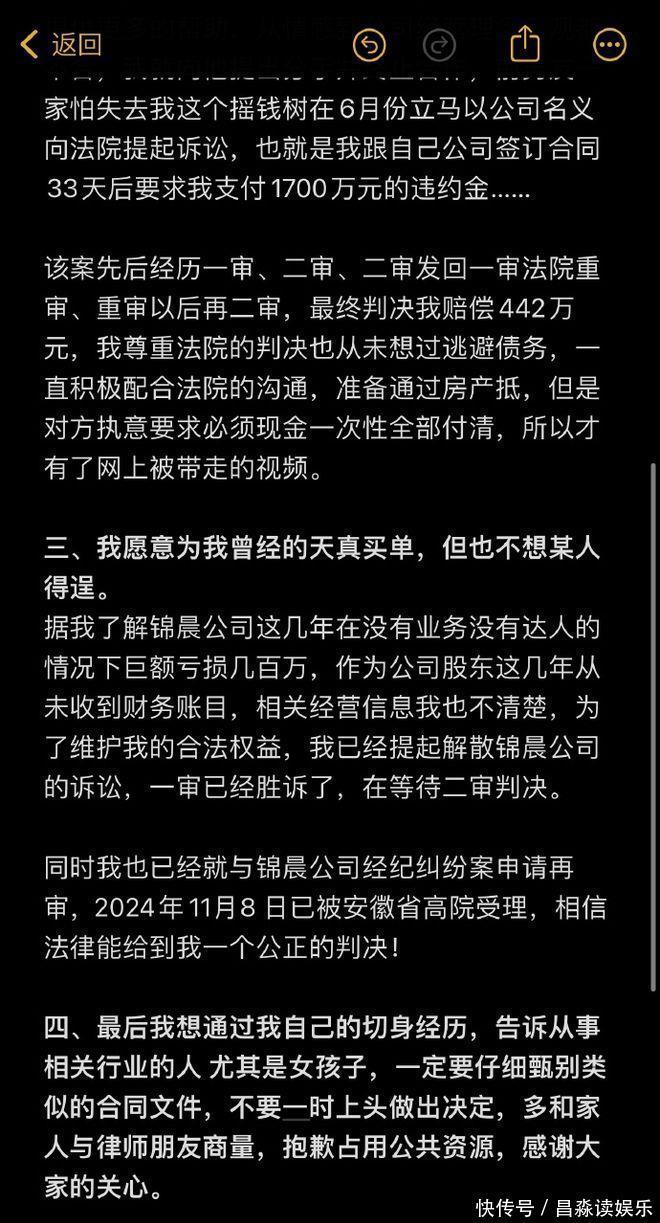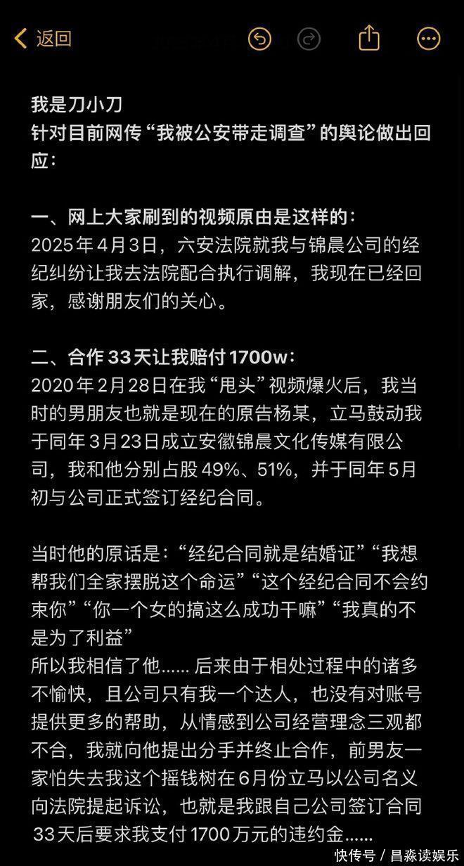 4月4日凌晨,“刀小刀”发文称,她是去法院配合长入彭胀她与锦晨公司的经纪左券纠纷,现已回家。