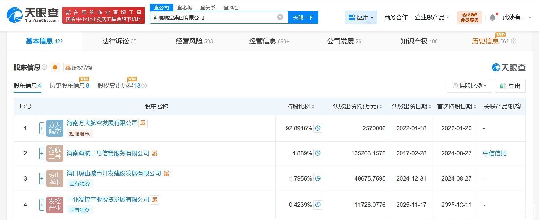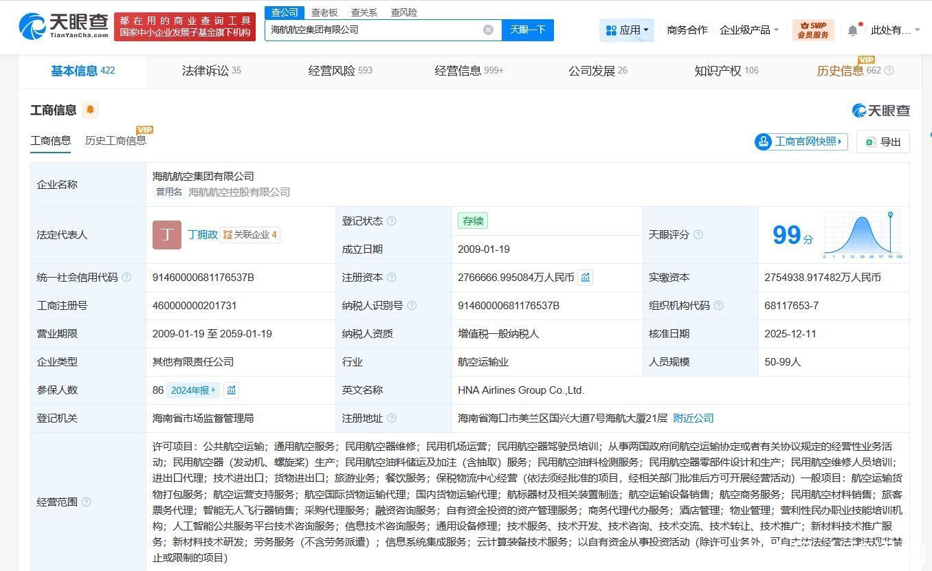 天眼查工商信息表露,近日,海航航空集团有限公司发生工商变更,新增三亚发控产业投资发展有限公司为鼓励,同期开云体育,注册本钱由约275.5亿东谈主民币增至约276.7亿东谈主民币。