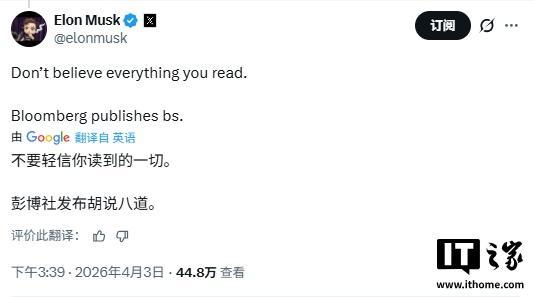 IT之家 4 月 5 日音讯,埃隆 · 马斯克常在其外交平台 X 上赶快驳倒任何触及他本东谈主或旗下公司的诞妄信息。彭博社近期发布报谈称 SpaceX 磋议在改日几周动手初次公开募股(IPO),估值高达 2 万亿好意思元(IT之家注:现汇率约合 13.79 万亿元东谈主民币),该音讯被马斯克斥为“瞎掰八谈”。