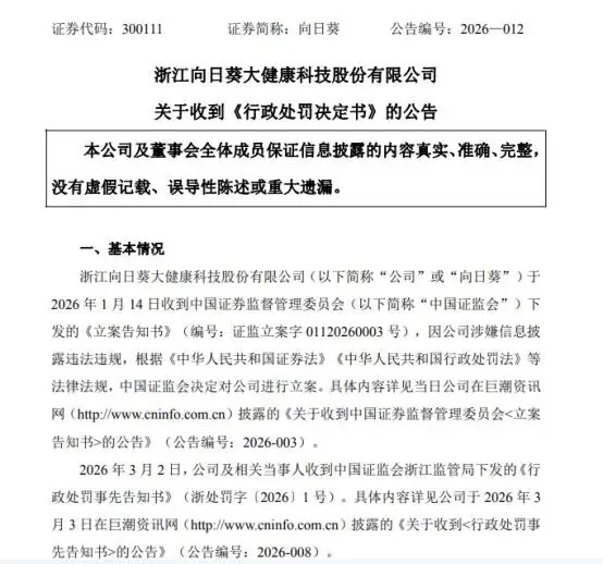 2026年4月8日晚,浙江向日葵大健康科技股份有限公司(下称:向日葵,300111.SZ)公告因要紧钞票重组预案存在误导性述说,公司及琢磨当事东谈主被中国证监会浙江监管局统共罚金510万元。这一事件并非伶仃的合规无理,其背后是公司在主业增长乏力、转型屡屡受挫的配景下,试图通过“蹭热门”来装束功绩、维系估值的深层博弈。公告讦出后,向日葵股价下落,截止4月9日收盘,向日葵股价下落4.6%。