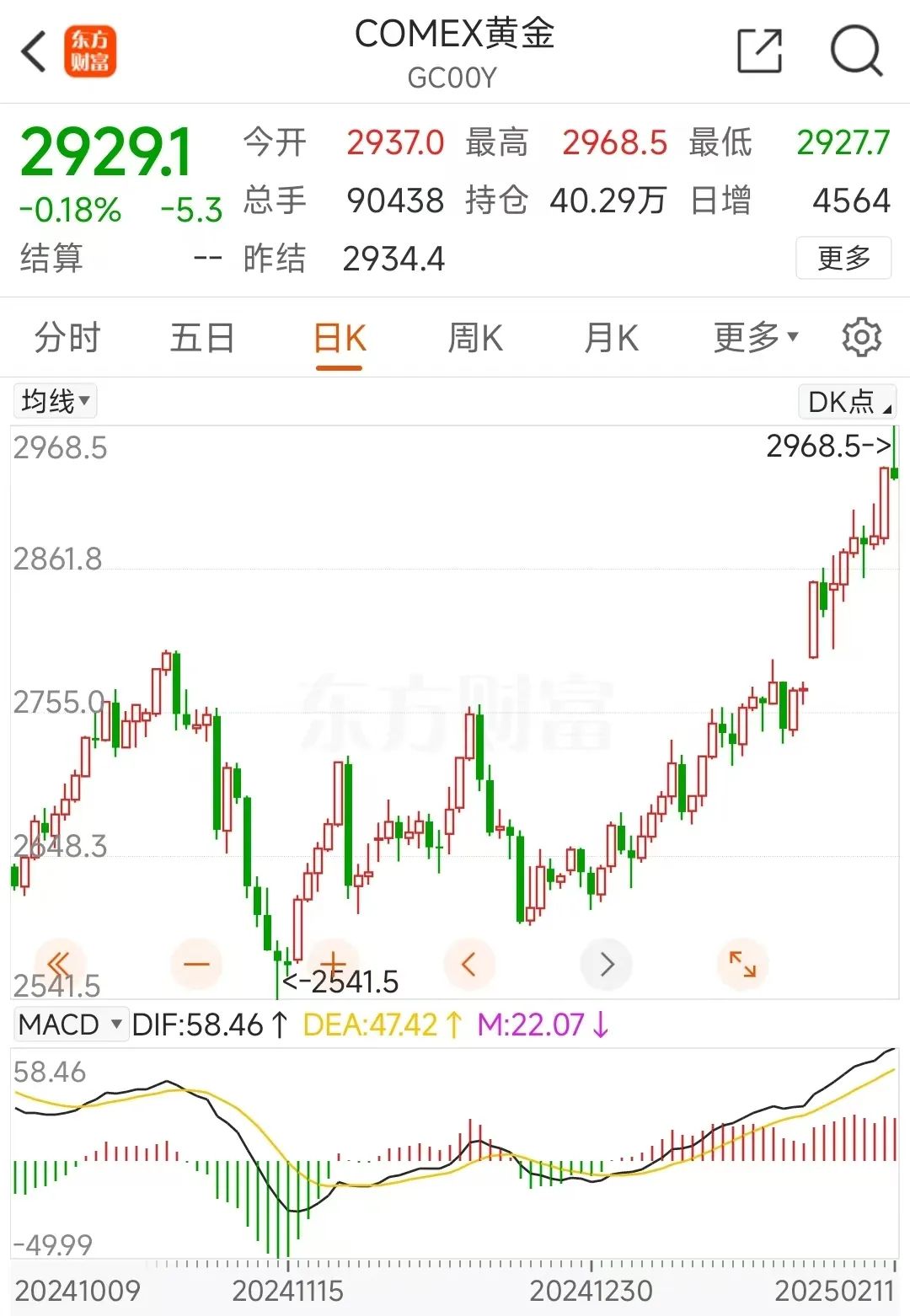 珠宝首饰板块、贵金属板块的走强,很猛经由上收成于国外金价的握续走高。数据涌现,COMEX黄金在2月11日盘中一度波及2968.5好意思元/盎司。年K线而言,COMEX黄金已3连阳,累计涨幅为60.59%。2025年以来,COMEX黄金累计上升11.06%。