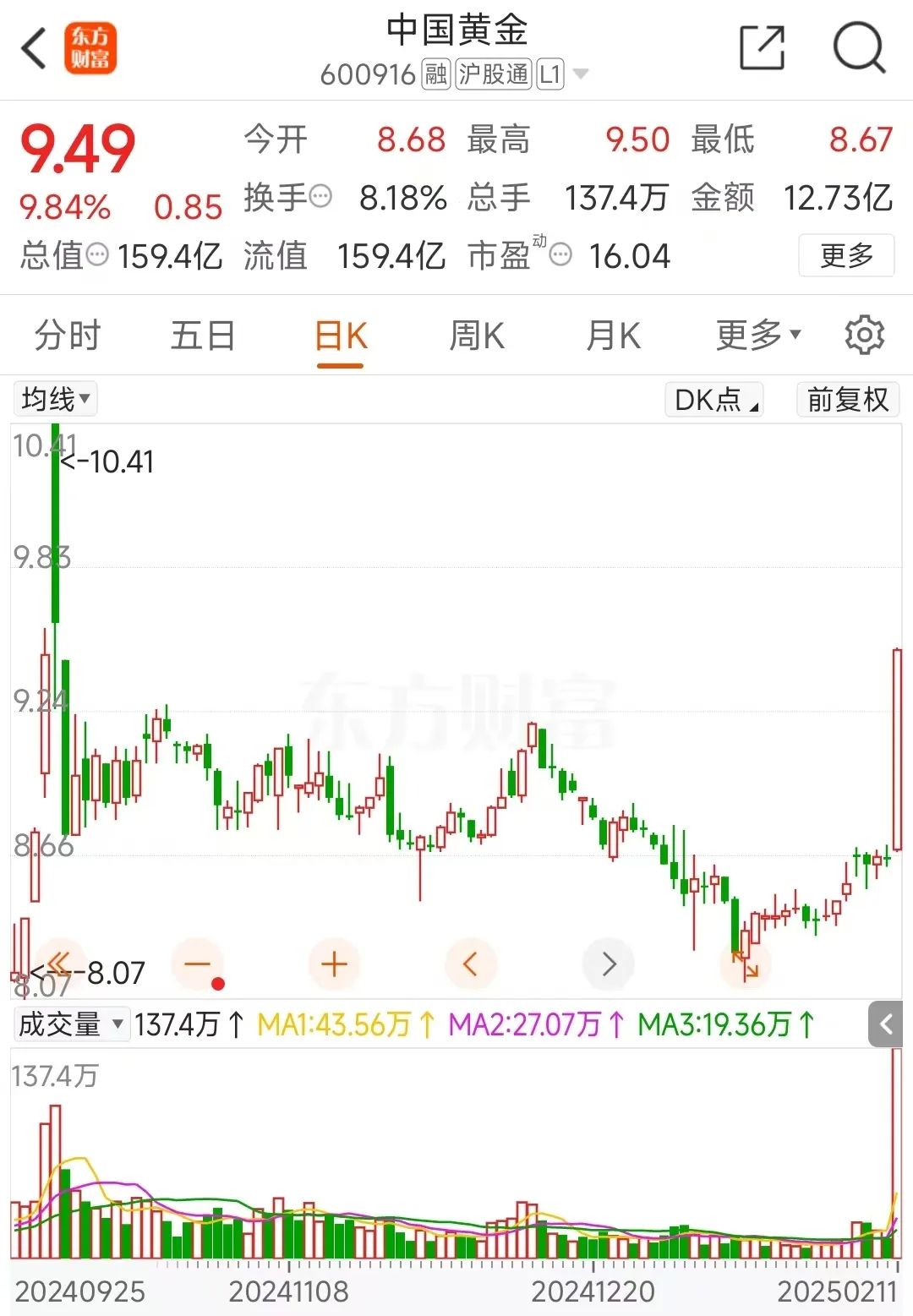 看个股的话,中国黄金周二高开高走,10点32分波及涨停,收盘时涨幅9.84%,差1分钱涨停。自1月13日开启新一轮反弹以来,中国黄金累计上升14.89%。
