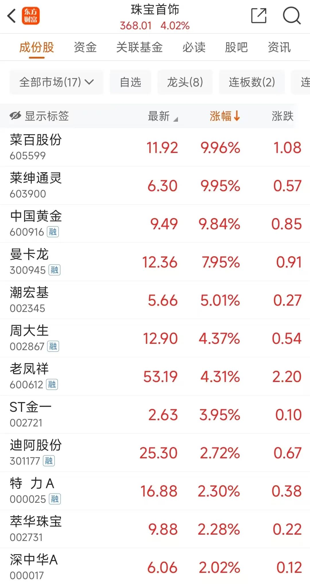 周二,珠宝首饰板块举座强势,菜百股份、莱绅通灵涨停;曼卡龙、潮宏基、周大生、老凤祥也涨幅居前。