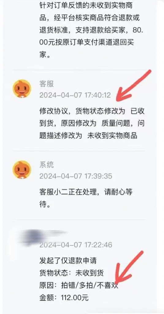 2022年景交的订单,买家先以“未收到货、拍多/拍错/不可爱”为由央求“仅退款”,后改成“已收到货、质料问题”二次央求后平台退款了80元