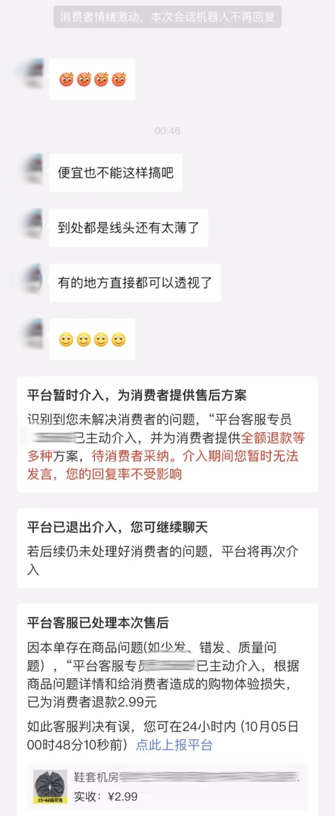商家和消耗者对南风窗提供的记载骄傲,以某电商为例,机器东谈主会监测消耗者和商家的对话,包括重要字眼和情怀,并以秒级速率介入售后,而平台介入本事,商家无法发言。王昌平告状的纠纷中,从买家凌晨近1点发出第一条讯息“在”,到平台为其“仅退款”得胜,用时仅3分钟。