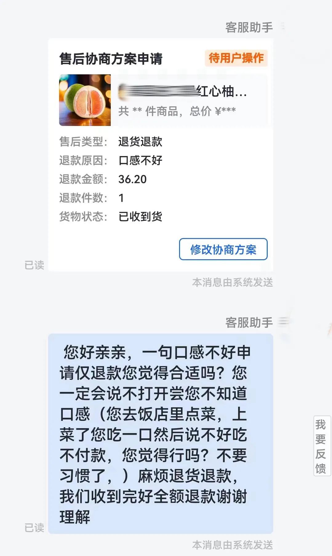 在南风窗采访的12名商家中,硬刚“仅退款”用户的商家是少数,鉴于相通、陈诉、征集凭证费时悲凉且陈诉得胜率低,商家还可能被买家投诉、吃平台劝诫和罚金,尤其对货值不高的商家来说,委曲求全、暗里吐槽是他们更常见的格调。